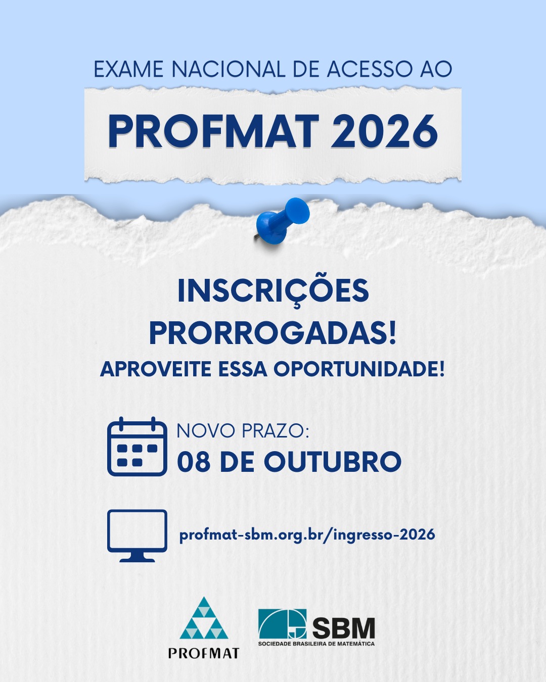 As inscrições para o Exame Nacional de Acesso ao PROFMAT 2026 foram prorrogadas até o dia 08 de outubro de 2025. Para conferir o Edital retificado e se inscrever acesse:…